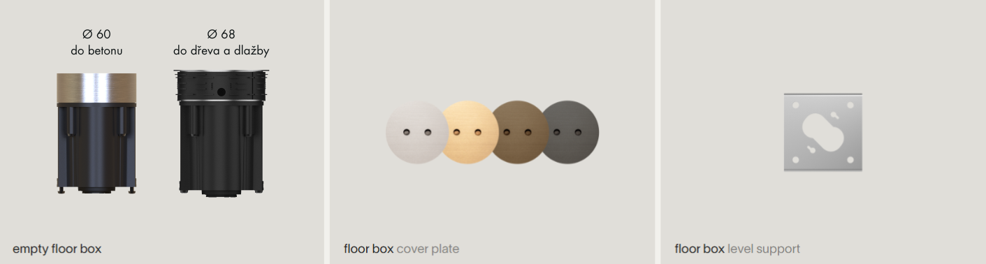 Sortiment a příslušenství podlahové řady — prázdné podlahové krabice (do betonu nebo do dřeva a dlažby), kryty podlahových zásuvek