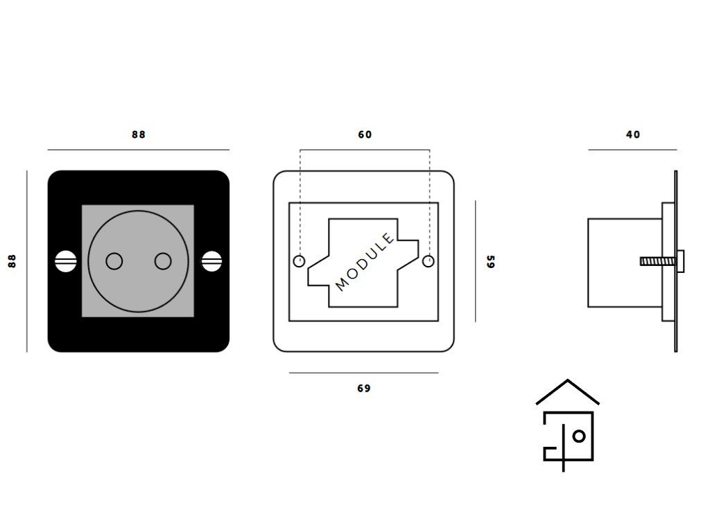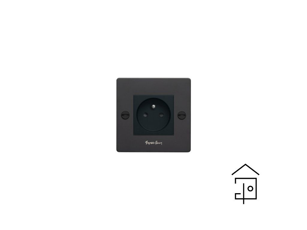 1G EURO zásuvka typu E s plochým krytem z masivního kovu s mincovými šrouby. K dispozici v pěti různých provedeních, lze je kombinovat s našimi stmívači a páčkovými vypínači ve stejném designu.