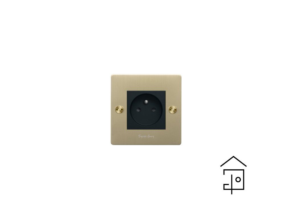 1G EURO zásuvka typu E s plochým krytem z masivního kovu s mincovými šrouby. K dispozici v pěti různých provedeních, lze je kombinovat s našimi stmívači a páčkovými vypínači ve stejném designu.