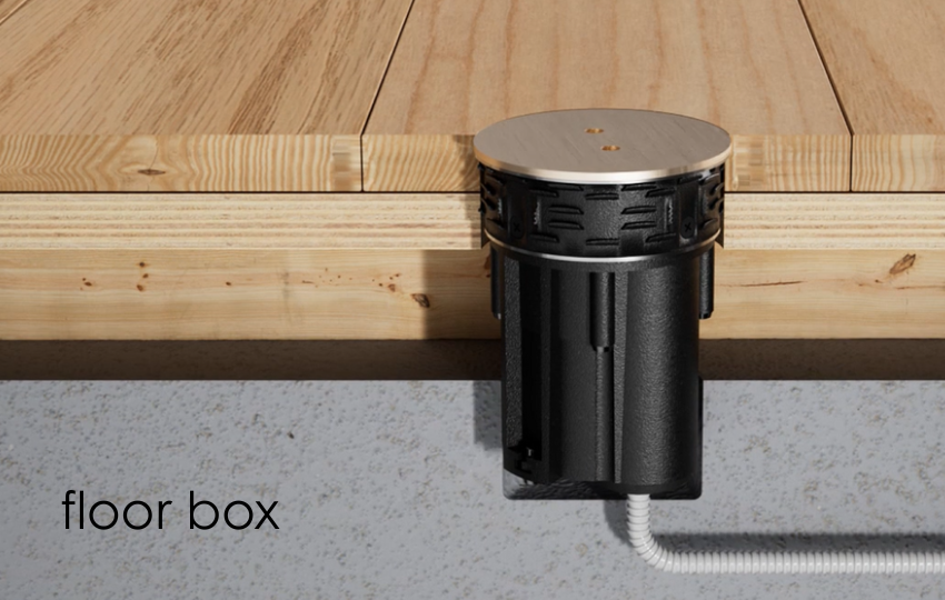 Podlahové zásuvky vycházejí ze stejného minimalistického designu a lze je neviditelně integrovat do dřeva, kamene nebo betonu.