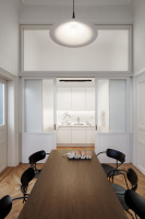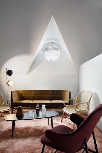 Die Eleganz der Bausubstanz dient als Orientierung für die neue Innengestaltung des Hauses. Die Vorstellung um Franz Kafka durchdringt die historische Schicht und die Gegensätze zwischen Leben und Tod. Die Atmosphäre auf den 2., 3. und 4. Etage wird durch eine Mischung aus hellen und schattigen Bereichen bestimmt. Die Basisfarben sind Hellgrau und Weiß, die durch Rot- und Violetttöne ergänzt werden. Die Möbelauswahl liegt an der Schnittstelle zwischen Vergangenheit und Moderne. Die Konstruktion, die sich durch einfache Gestaltung auszeichnet, besteht aus hochwertigen Materialien wie Holz und Metall.