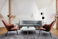 Ein wichtiger Teil des gesamten Umbaus sind die Dachgeschosswohnungen, die sich durch ihre völlig offenen Räume auszeichnen. Historische Holzbalken spielen mit modernen Glaselementen und maßgeschneiderten Einbaumöbeln. Die neu renovierten Innenräume des Kafka-Hauses vereinen klassische und moderne Elemente, Zartheit mit Dekadenz, Pracht und Gemütlichkeit. Gleichzeitig ist es gelungen, die Atmosphäre von Kafkas Zeit in ein Spiegelbild der handgefertigten Kacheln zu verwandeln, so wie sie aus den Schatten des Gebäudes selbst auf uns einwirkt.