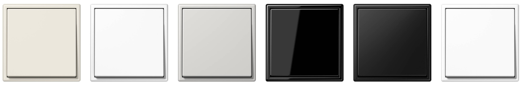 The frames, cradles and other central parts of the JUNG LS990 design series are available in plastic: ivory white, alpine white, light grey, black, matt white and matt graphite black or in metal: stainless steel, aluminium, anthracite, dark, chrome, gold painted, gold plated, brass and antique brass.