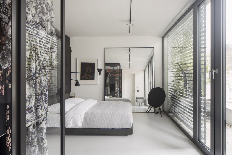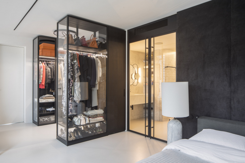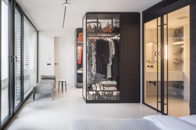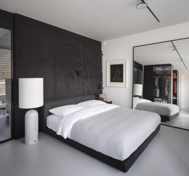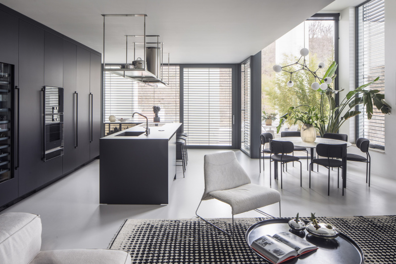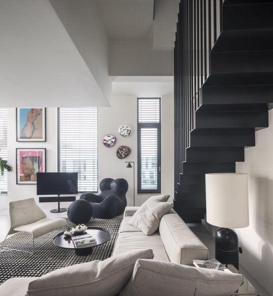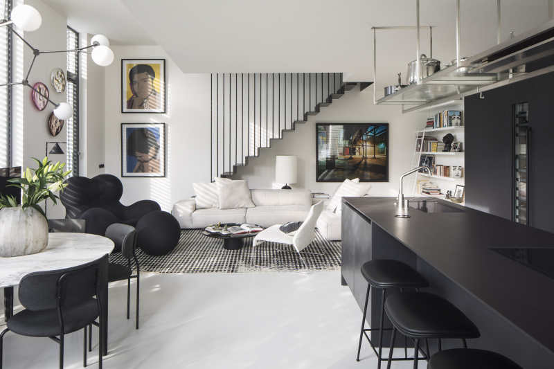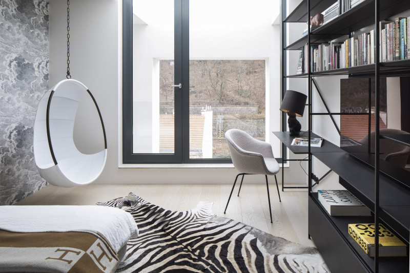 The glass facade with anthracite frames led the designer to the black and white design of the entire apartment. The dominant feature of the living room is an atypically designed staircase made of subtle black lacquered sheet metal, under which lies a snow-white sofa complemented by the iconic UP 50 armchair from B&B Italia. Unmissable in the living space is the elegant minimalist kitchen line Xila from the Italian manufacturer Boffi. It is finished in black matt lacquer, has a ceramic worktop, and is equipped with Gaggenau appliances. On the same floor as the living room, there is also a master bedroom with a dressing room and a very original glass bathroom. "Both bathrooms, on the lower and upper floors, are designed in the same way - in a combination of Carrara marble, white screeds and cast white floors," describes Ivanka Kowalski.