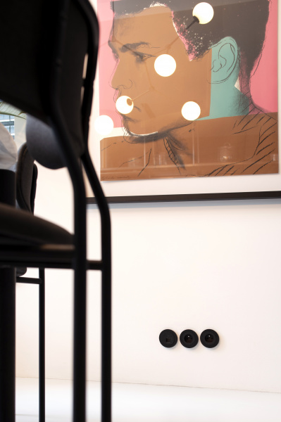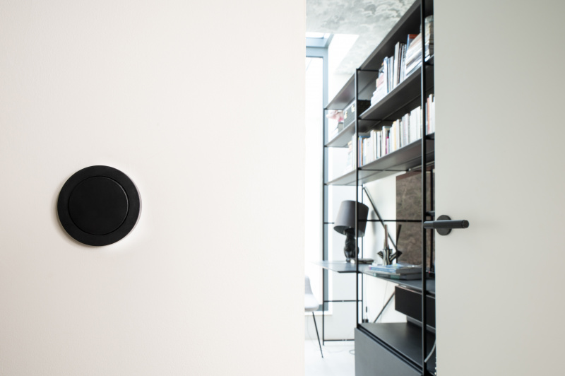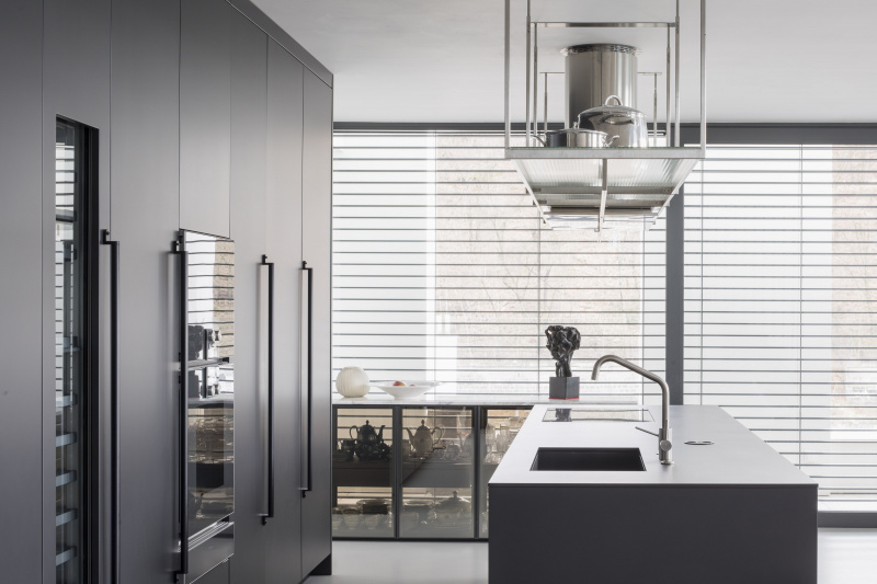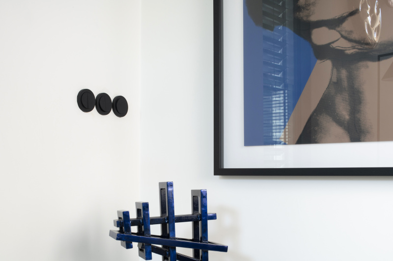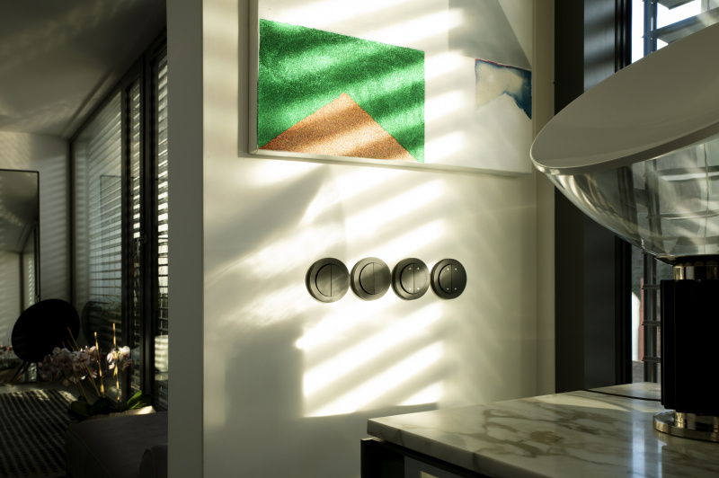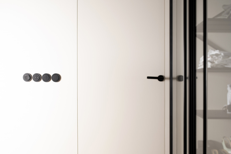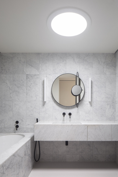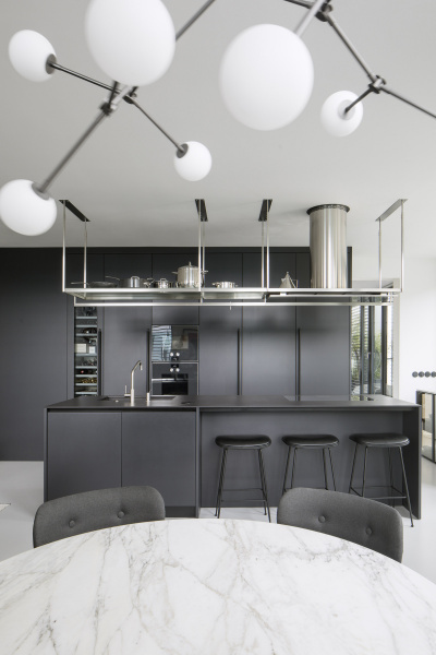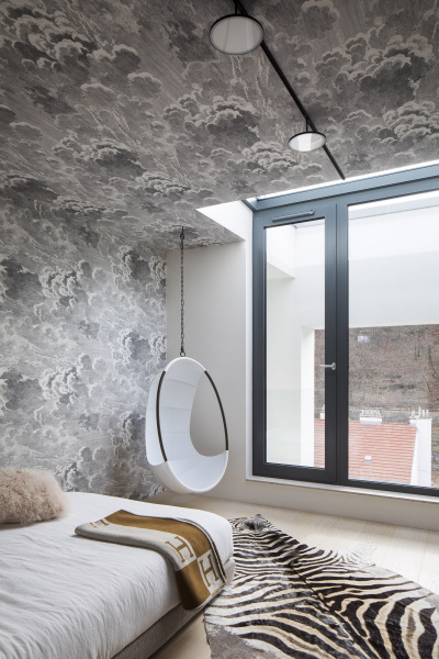 The glass facade with anthracite frames led the designer to the black and white design of the entire apartment. The dominant feature of the living room is an atypically designed staircase made of subtle black lacquered sheet metal, under which lies a snow-white sofa complemented by the iconic UP 50 armchair from B&B Italia. Unmissable in the living space is the elegant minimalist kitchen line Xila from the Italian manufacturer Boffi. It is finished in black matt lacquer, has a ceramic worktop, and is equipped with Gaggenau appliances. On the same floor as the living room, there is also a master bedroom with a dressing room and a very original glass bathroom. "Both bathrooms, on the lower and upper floors, are designed in the same way - in a combination of Carrara marble, white screeds and cast white floors," describes Ivanka Kowalski.