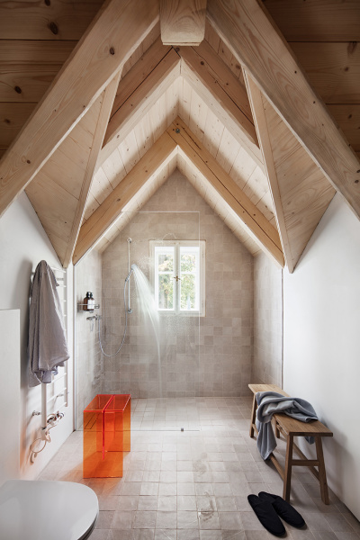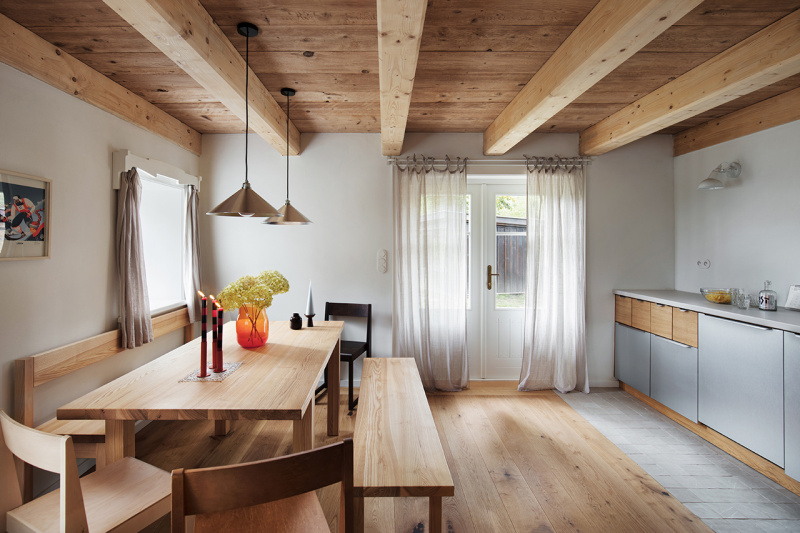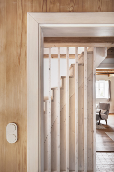 The layout of the interior rooms, which copy its original state, was also the starting model. On the ground floor, there is a generous living room with a tiled stove, a sitting area and a kitchen background with the possibility of opening the French window and opening the entire space to the garden. The separate kitchen, oriented to the east, works perfectly for breakfast and offers all the facilities for comfortable cooking. The building also has two separate bathrooms with a toilet and a shower. On the upper floor there are two bedrooms with the possibility of accommodation for a total of 8 people. A separate sauna is also adjacent to the cottage.