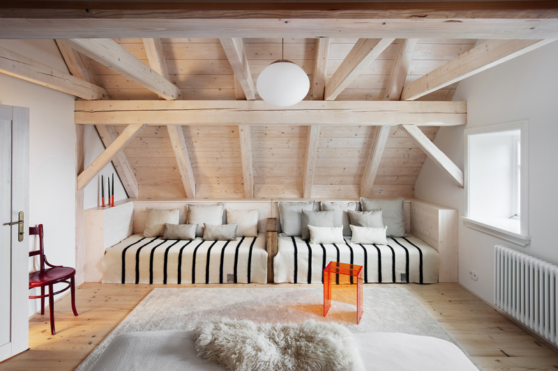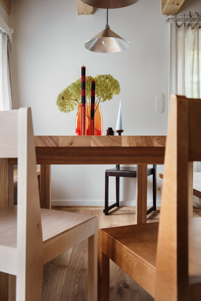 Furniture design balances on the border between past and present. We deliberately combined several types and shades of wood, metal and light tones, then in detail the warm orange colour is projected through the spaces. The furniture is designed in a simple shape and in high-quality materials of metal or solid wood. The range of furniture is made to measure by joinery workshops, or it is a refurbishing of old pieces of furniture and lighting. From the current design, we then chose Scandinavian producers.