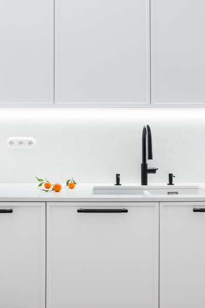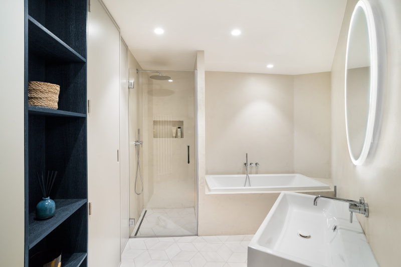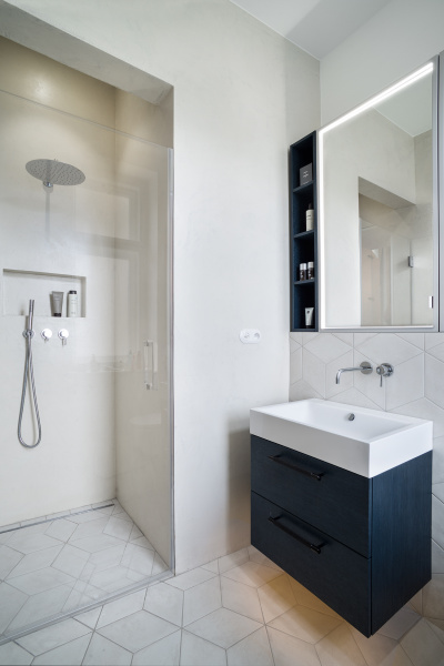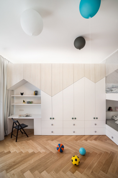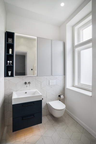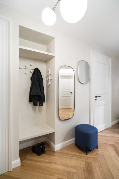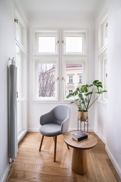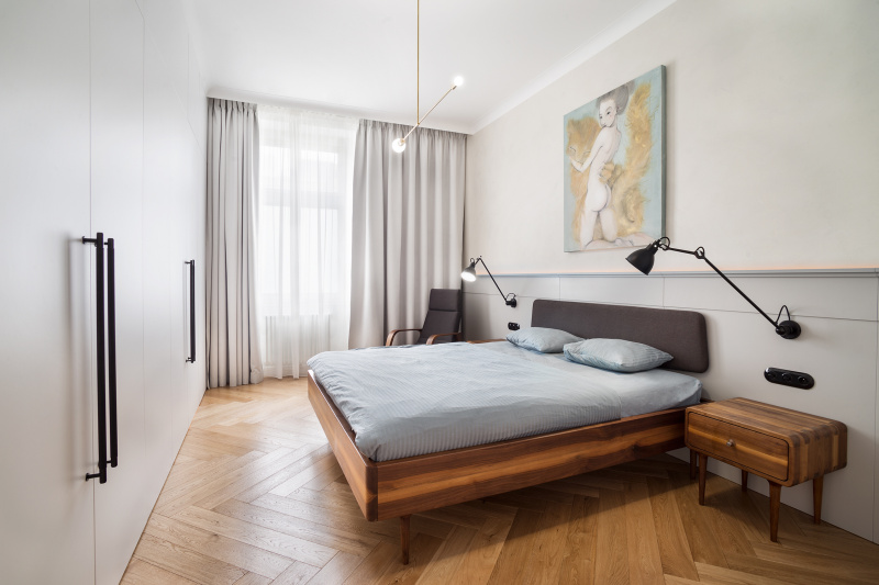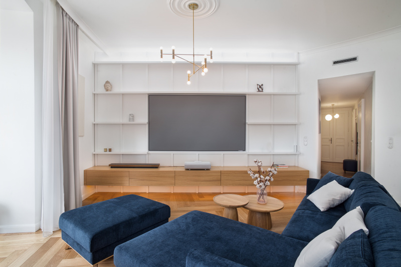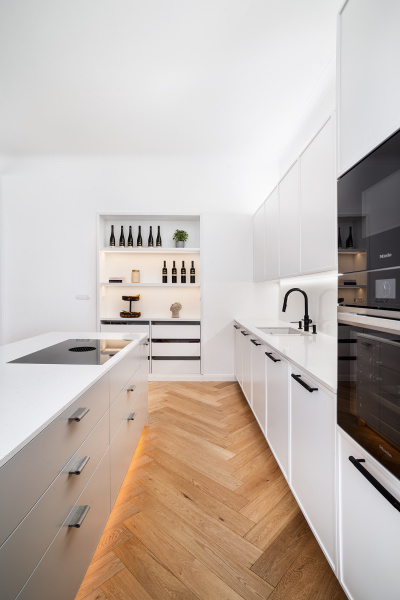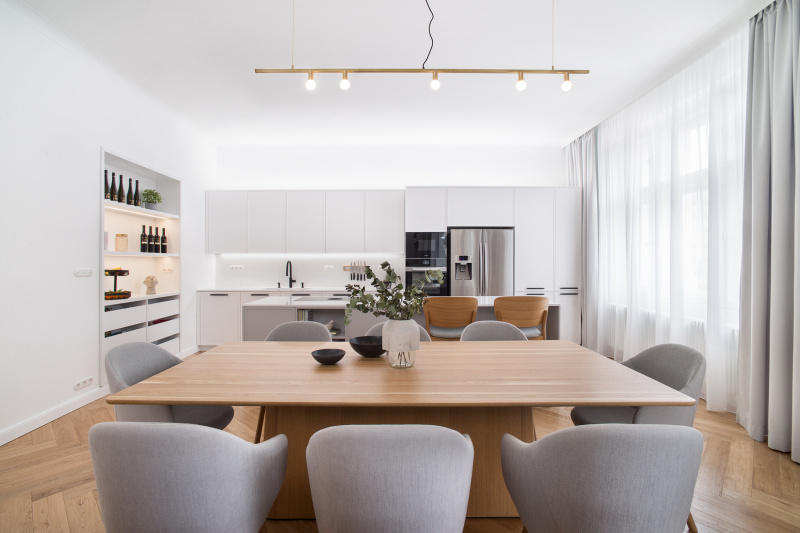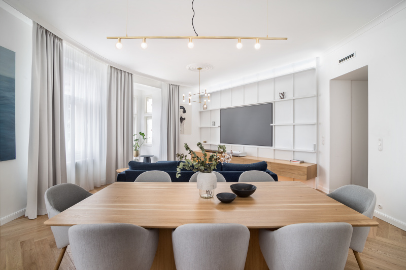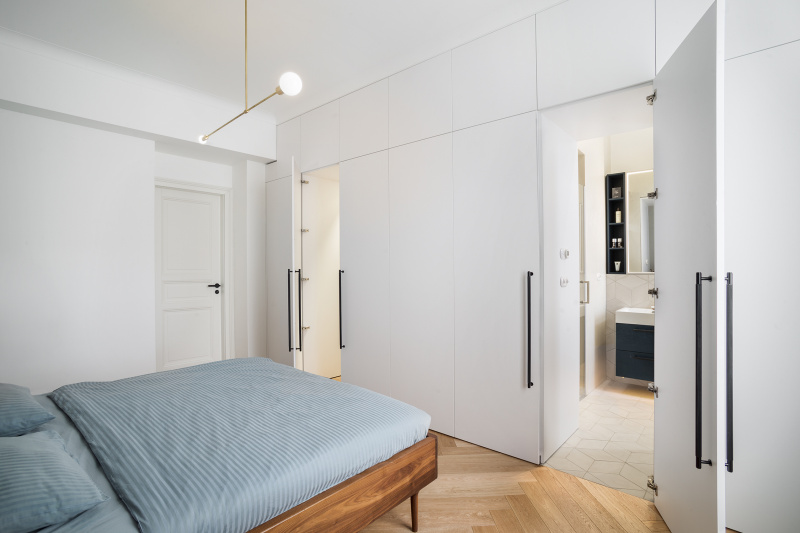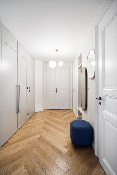 The studio embraced the modifications generously and the layout underwent fundamental changes. The kitchen was moved to a large living room, which was created by connecting two original rooms. This intervention required more extensive static work. Now the apartment is designed as a 4kk with two bathrooms. Both bathrooms are accessible through joinery elements and are therefore hidden from the eyes of visitors. In the bedroom, there is a built-in wardrobe for the entire width of the room, through which it is possible to enter the bathroom and dressing room. The second bathroom is located behind the closet by the main entrance. The remaining part of the cabinet accommodated the condensing boiler and technical facilities. The apartment is bathed in light colors, dominated by a combination of white, gray and oak wood decor. On the floor, we designed and installed a wooden floor laid in a parquet pattern. An interesting element is the dark blue lacquered oak veneer. The dominant lights are brass as a reference to the history of the space and the object.