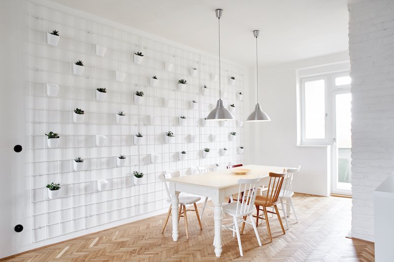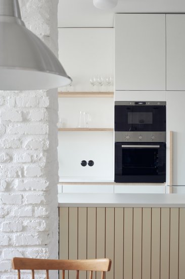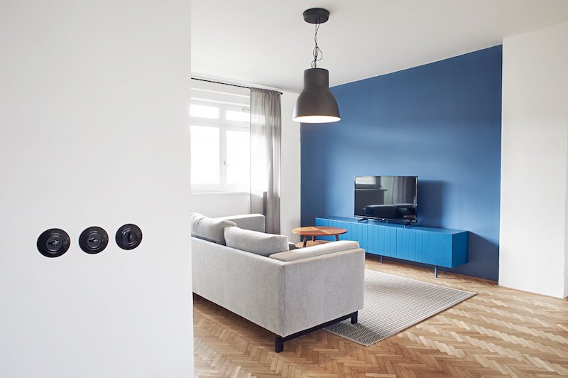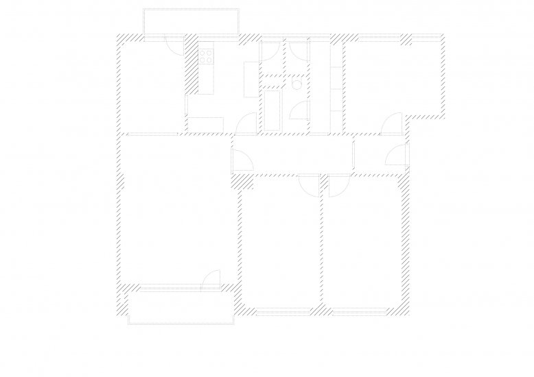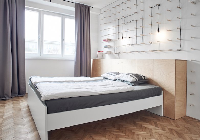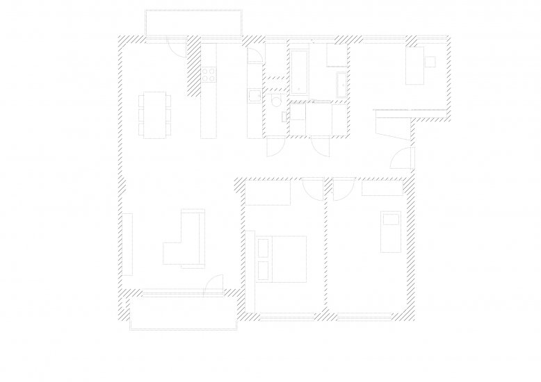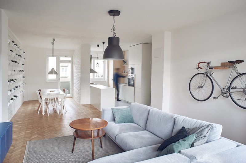 Few people would have expected such an interior space from the perspective of an apartment building from the 1960s. Behind the insulated facade with plastic windows, however, is not quite an ordinary apartment. Its advantage is a generous floor area and ceiling heating. It was necessary to highlight here. Views are created through the entire apartment in both of its axes. The total length of the apartment can be seen from the entrance door. The living room with dining room and kitchen extends across the entire width of the apartment - respectively the floors - and thus there is access to both balconies from here. The new was combined with the old, the banal with the unexpected. They used a curry net to hang the plants, instead of a picture or an author's element, the architects hung a bicycle (authentic means of transport for control days) on the wall as a symbolic initial for the completed project.