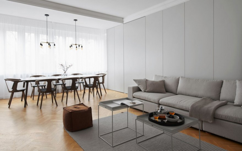 The interior is dominated by high-quality natural materials and painted surfaces in several shades of gray, which naturally follow each other. When choosing the equipment, the architects managed to connect current trends and design from the middle of the last century, when design icons of well-known creators were created.