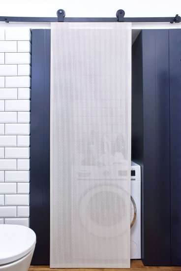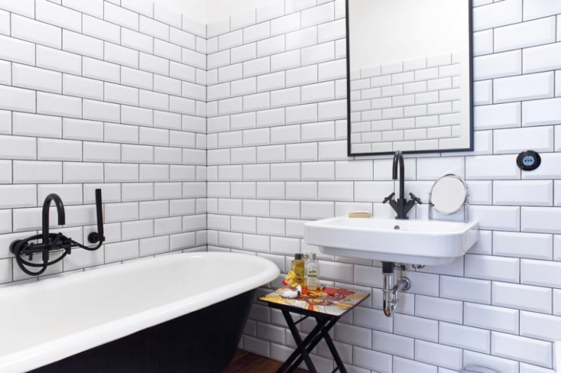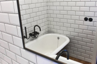 Each of the bathrooms is completely in a different spirit. In the first one, we used a renovated historic bathtub. In the second bathroom, the dominant feature is the tropical wood panel in contrast with the concrete surface of the walls and the stainless steel toilet.