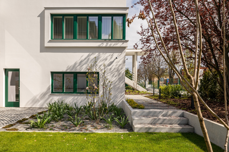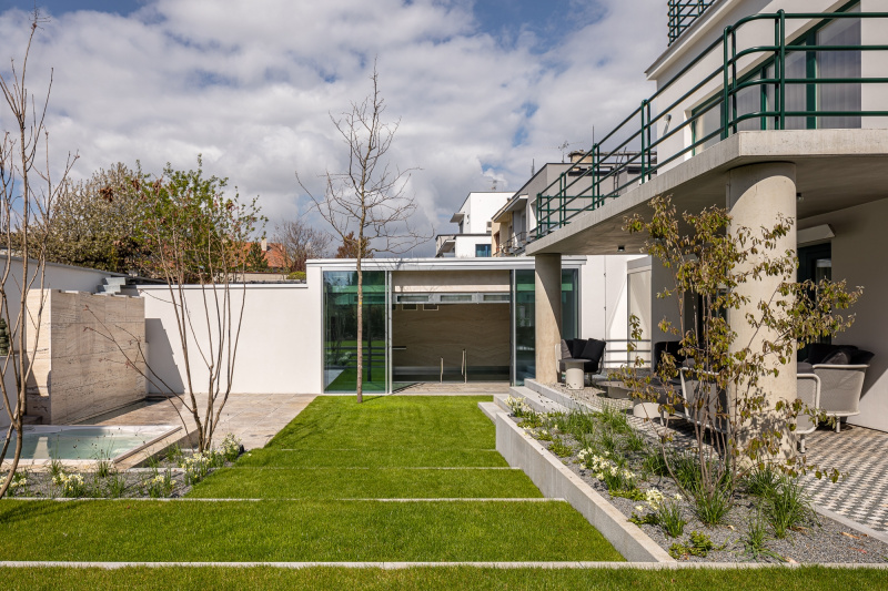 The building has already undergone one reconstruction - in the nineties, however, it did more harm than good and completely stripped the villa of its functionalist identity. At that time, the layout of the house was fundamentally changed, the construction of a large terrace represented a major visual intervention in the original form. The building was insulated and painted a distinctive blue color. On the other hand, the recent renovation, led by the studio PAB architectural office, brought the building a cleansing from the insensitive interventions of the 90s and a return to the original concept of functionalism, but also the enlargement of the entire house with regard to the size of the family. The oversized terrace was removed and replaced with a more subtle one. The house was enlarged by adding one floor. The new superstructure is visually separated from the lower part by a continuous glass strip, the color of the superstructure is unified with the house. All the structures of the original house were rebuilt with solid brick. The garage also received changes. The original garage level with the fence was removed and newly moved to the level of the house. The mass of the garage recedes in a terraced manner so that it has the smallest possible volume in the garden. All levels of the terraces are equipped with a green roof and thus naturally follow the landscaping of the garden. The garage is connected to the main house by a glass neck and behind it hides a wellness area with a swimming pool and sauna as well as the necessary home technology. Work on the villa continues even now, when the cellar is being converted into a wine cellar.
