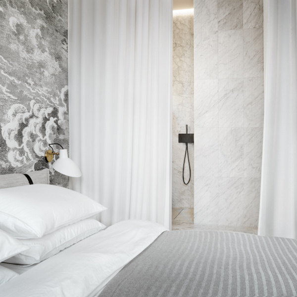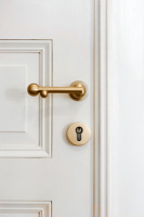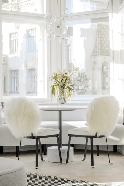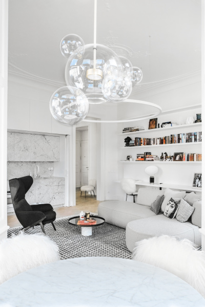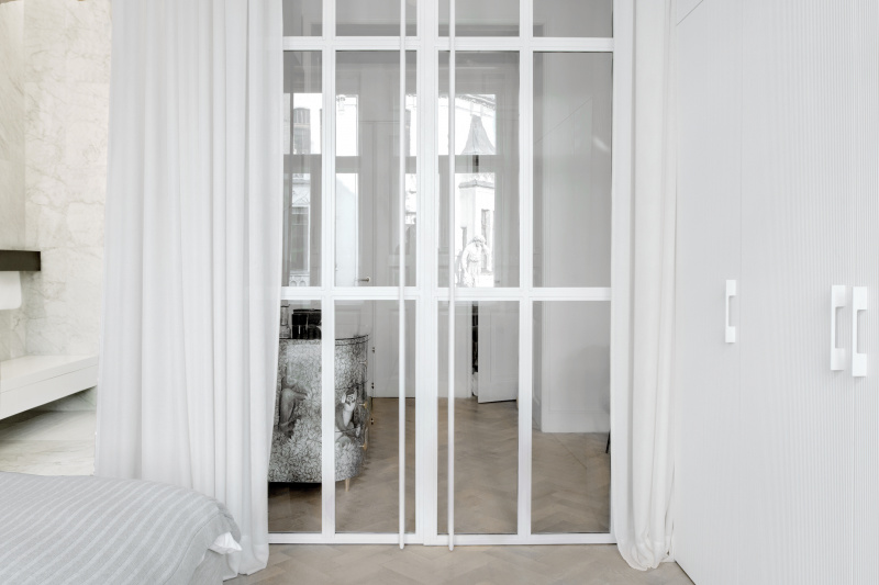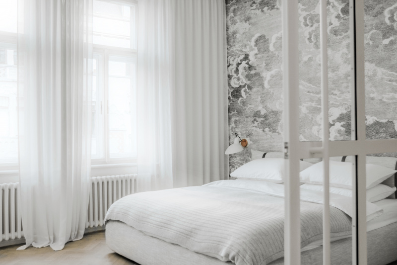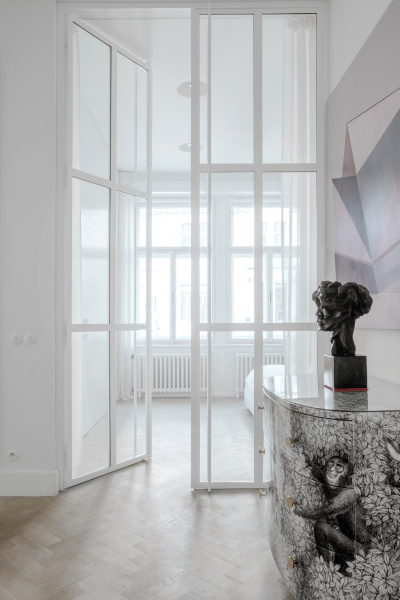 Po zdařilé rekonstrukci je byt materiálově založen na kombinaci bělených původních dubových parket se smetanově bílou výmalbou a lakovanými kazetovými obklady, doplněné šedo-bílým Kararským mramorem a detaily z mosazi. Noblesní atmosféru bytu s vysokými štukovými stropy dotváří litinové radiátory a retro otočné vypínače a zásuvky berker serie 1930. Všechny tyto detaily podtrhují celkový charakter prostoru. Dále byl interiér vhodně doplněn o ručně vyráběná svítidla od Michaela Anastassiada či Giopato Coombes a kolekci kování a úchytek od belgické manufaktury Maison Vervloet, vše z portfolia designového obchodu Monobrand. „Na malém prostoru je o to důležitější práce s detaily, jako jsou kvalitní vypínače nebo dveřní kování. Svým nadčasovým vzhledem a materiálovou poctivostí dokážou interiéru dodat onu pověstnou třešinku na dortu,“ vysvětluje Katrin Grund, majitelka obchodu Monobrand.