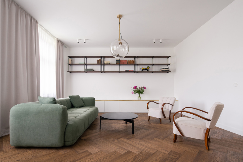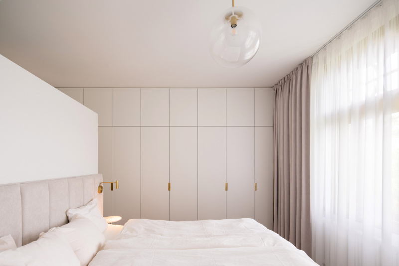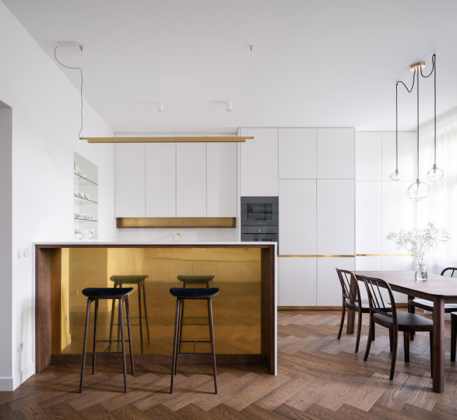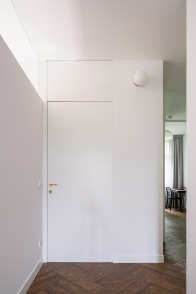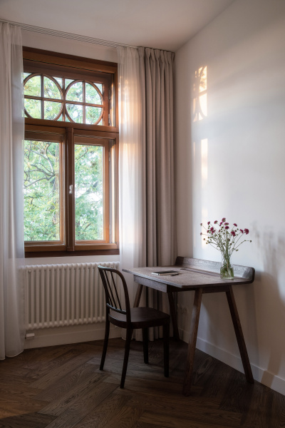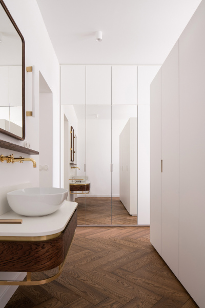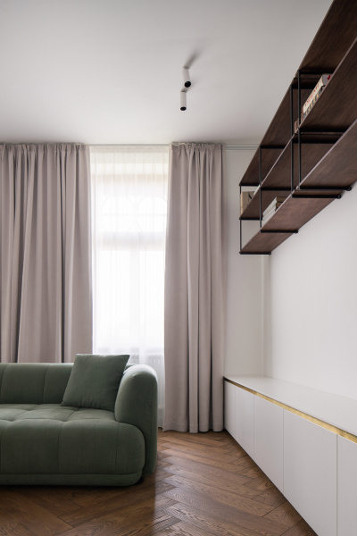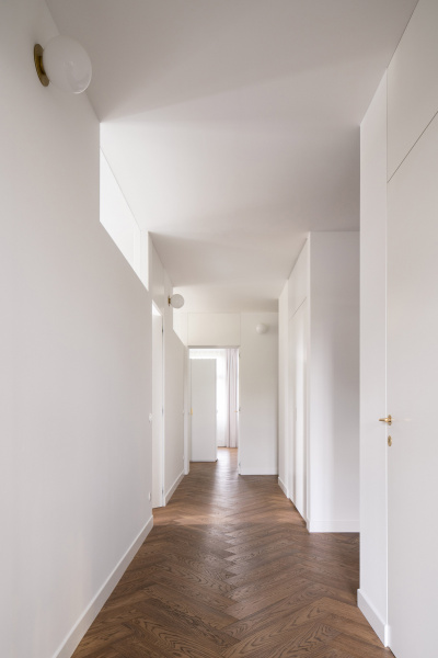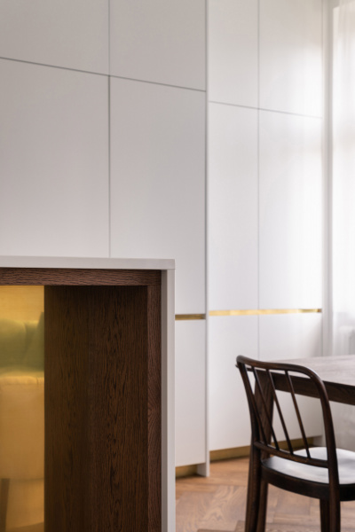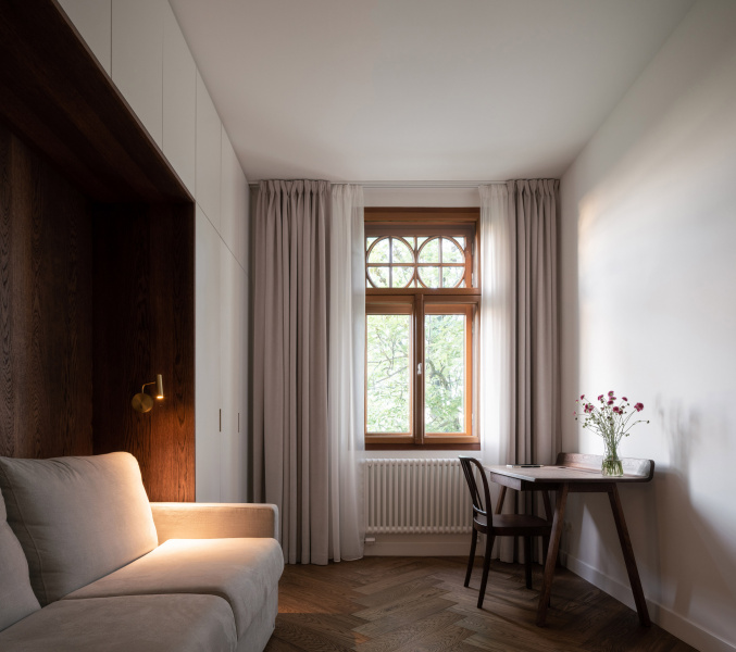 Nový interiér historické vily odráží pečlivý výběr designu, který spojuje minulost s přítomností. Tmavě olejovaný dub na parketových podlahách i nábytku a akcenty z přírodní mosazi budou s časem získávat přirozenou patinu. Sádrové stěrky na stěnách mají matný bílý nátěr jednotný s lakem dveří a lakem vestavěného nábytku. Architekti nechávájí tím vyniknout hru světla a stínu.