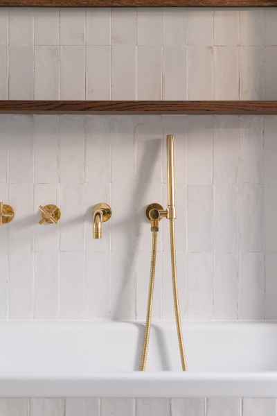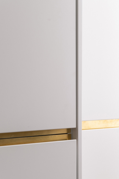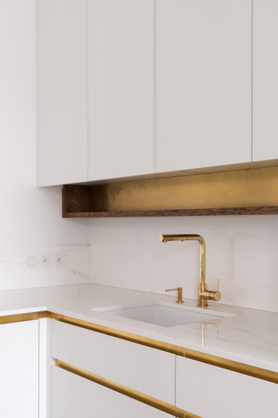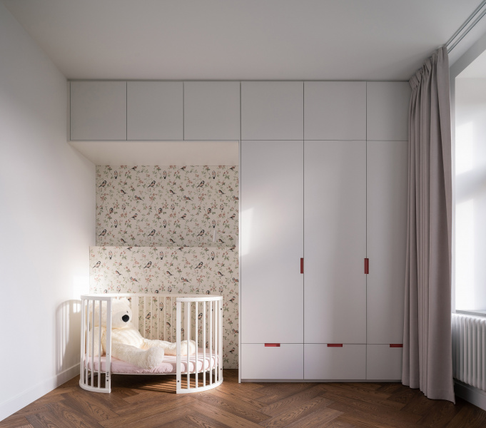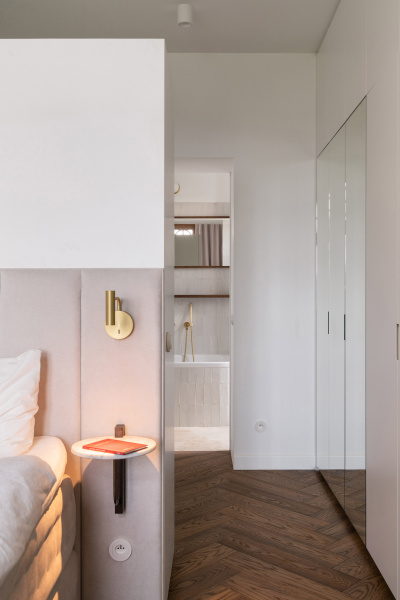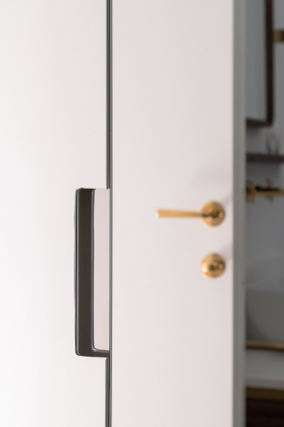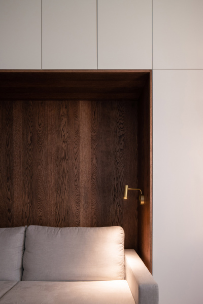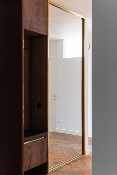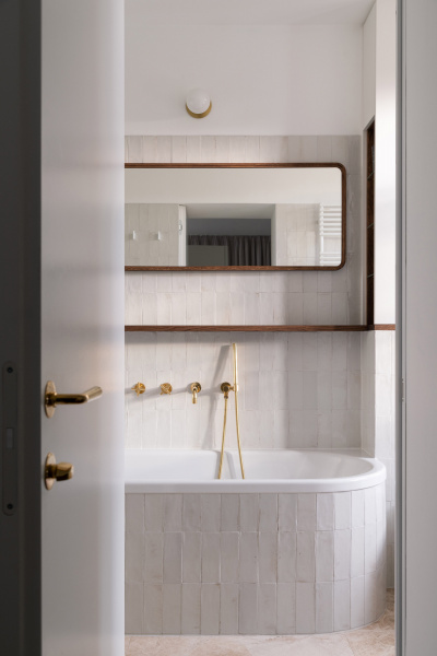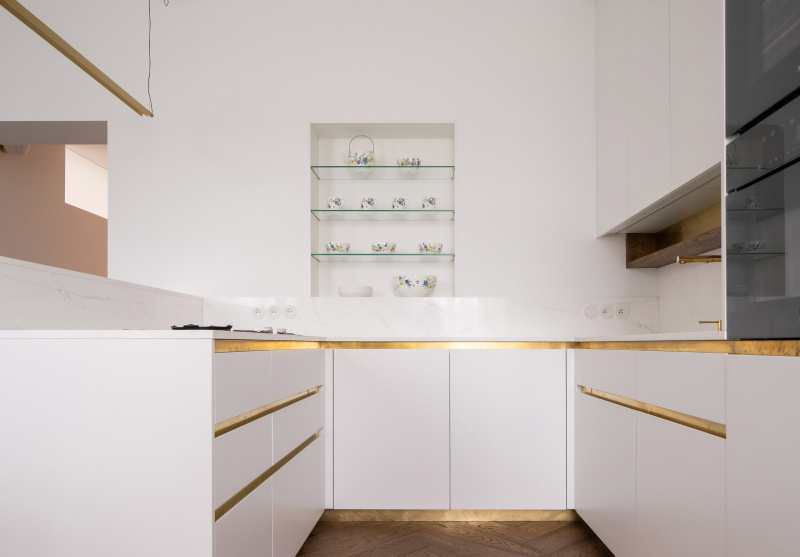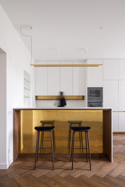 Nový interiér historické vily odráží pečlivý výběr designu, který spojuje minulost s přítomností. Tmavě olejovaný dub na parketových podlahách i nábytku a akcenty z přírodní mosazi budou s časem získávat přirozenou patinu. Sádrové stěrky na stěnách mají matný bílý nátěr jednotný s lakem dveří a lakem vestavěného nábytku. Architekti nechávájí tím vyniknout hru světla a stínu.