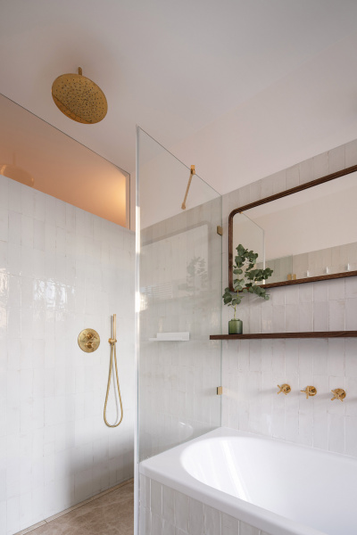 V koupelnách kombinujou nepravidelné tvarované obklady s jemnou kresbou mramoru na podlaze. Vášeň investorů pro sklo se odráží v množství zrcadel, skleněných svítidlech i dlouhém parapetu v obývacím pokoji navrženém jako sokl pro výstavu skleněných objektů.