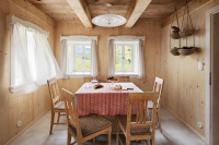 Výchozí předlohou je ovlivněna i dispozice vnitřních místností, která kopíruje její původní stav. V přízemí se nachází velkorysá světnice s kachlovými kamny, posezením a zázemím kuchyně. Francouzské okno umožňuje otevření celého prostoru a volný průchod z interiéru přímo do zahrady. Samostatná kuchyně orientovaná na východ zase atmosférou perfektně funguje při ranním sluncem zalité snídani. Kuchyně disponuje veškerým zázemím potřebným pro pohodlné vaření. V objektu dále najdete dvě samostatné koupelny s WC a sprchou. V horním patře potom dvě ložnice, kde se může ubytovat až 8 osob. K chaloupce patří také na přilehlém pozemku samostatně stojící sauna s dechberoucím výhledem do okolní krajiny.