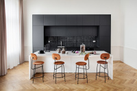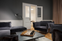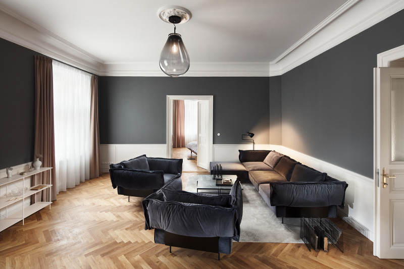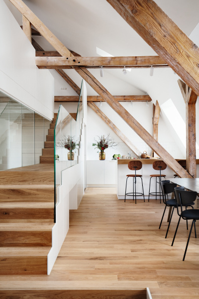 Důležitou součástí celé rekonstrukce jsou podkrovní apartmány, specifické svými plně otevřenými prostory. Historické dřevěné trámy si hrají s moderními skleněnými prvky a vestavěným nábytkem na míru. Nově zrekonstruované interiéry Kafkova domu kombinují klasické a moderní elementy, jemnost s dekadencí, nádheru a útulnost. Zároveň se podařilo přetvořit atmosféru Kafkovy doby do odrazu ručně vyráběných kachliček stejně tak jako na Vás dýchá ze stínů samotné budovy.