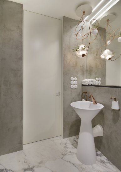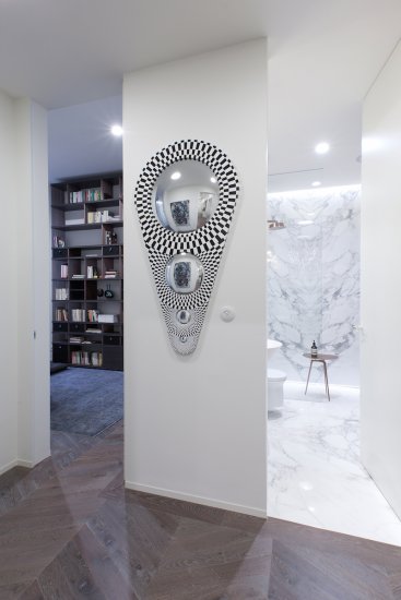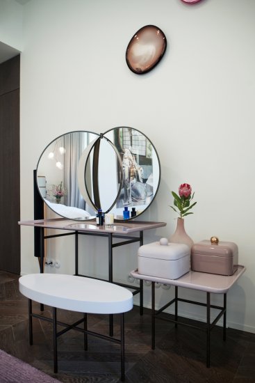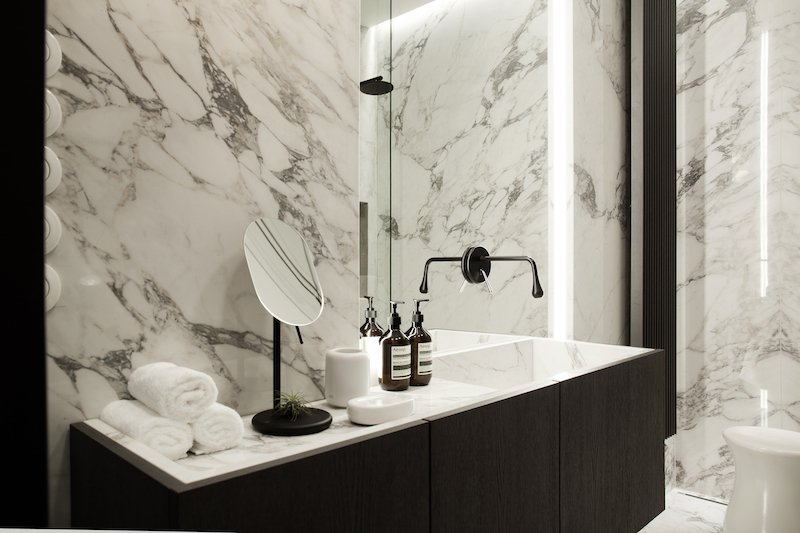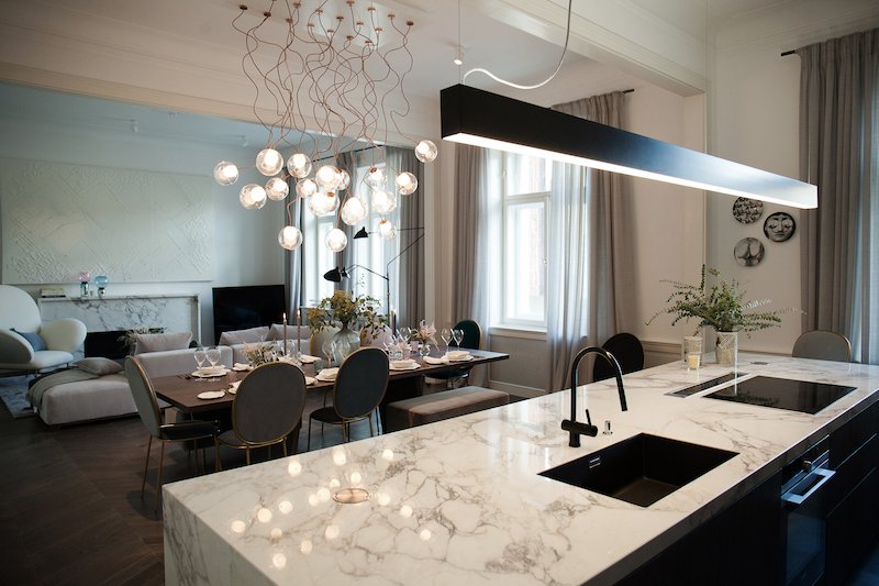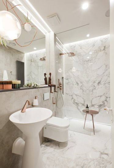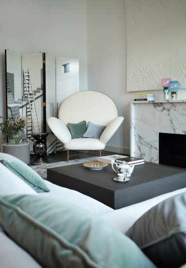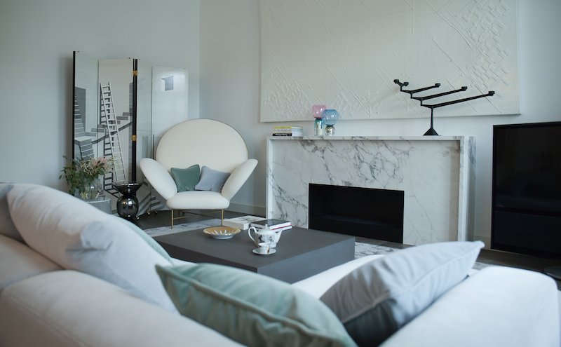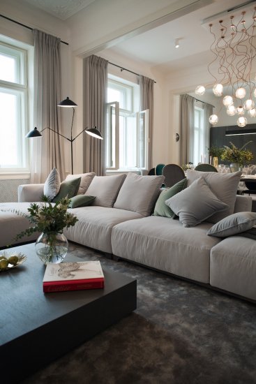 Byt pro čtyřčlennou rodinu od designérky Ivanky Kowalski je inspirován Paříží a snoubí v sobě jak ostrý minimalismus, tak oblé tvary a tradiční materiály. Najdete tu kombinaci leštěného mramoru v kontrastu s hrubou stěrkou a různými texturami. Do toho prostupují šedé odstíny dřeva a harmonické pastelové barvy. Krásu vysokých stropů zde podtrhuje umění. Byt nabízí fúzi starého a nového, to vše v příjemné atmosféře.