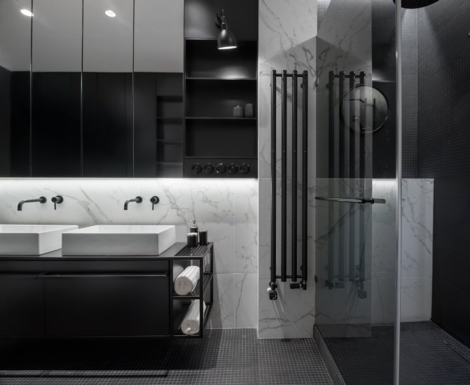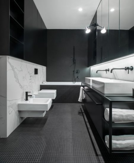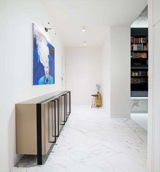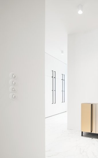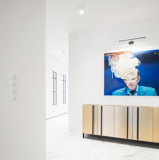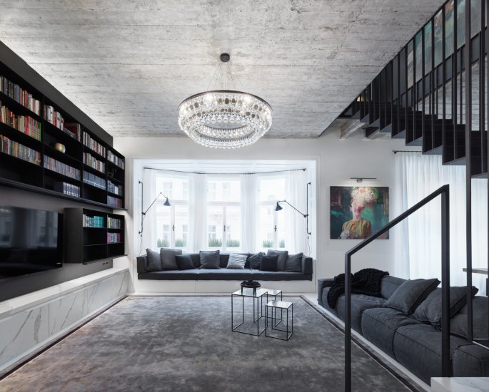 Mezonetový byt v historickém centru Prahy vznikl spojením dvou bytů nad sebou. Protože dům již v minulosti prošel razantní rekonstrukcí, objevili architekti po odkrytí sádrokartonových podhledů hrubé betonové stropy, které se rozhodli v interiéru přiznat. Tím vznikl zajímavý kontrast mezi historickými detaily, jako jsou profilace nebo obložení, a drsným betonem. Další hru kontrastu vnesly do interiéru retro otočné vypínače Hager ze série berker 1930 v bakelitovém provedení. Architekti citlivým způsobem použili na různých místech interiéru jak černou, tak i bílou barvu spínačů. Zatímco v kuchyni, koupelně nebo chodbě volili barvu vypínače tak, aby splynula s použitým povrchem, jinde dávají kráse vypínačů berker 1930 vyniknout díky použité kontrastní barvě vzhledem k povrchu.