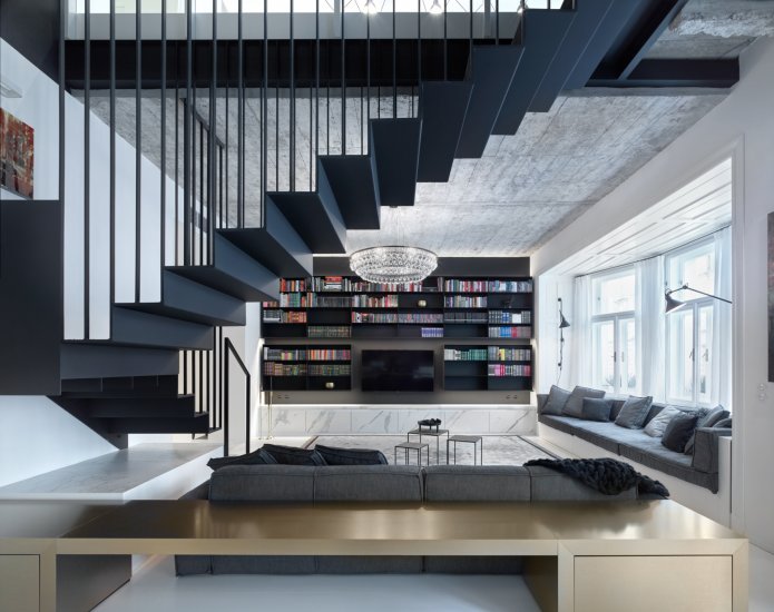 Celý interiér je laděný do monochromatických barev s drobnými akcenty mosazi. Ve spodním vstupním patře je situovaný obývací pokoj s hostinským pokojem a zázemím, v horním pak kuchyně s jídelnou a privátní ložnice. Na každém patře je umístěna samostatná koupelna. Největší prostor v celém bytě představuje obývací pokoj. Zajímavý pohled do ulice zde skýtá arkýř využitý pro vestavěné sezení. Na obou protilehlých stěnách obývacího pokoje zaujmou mohutné ocelové knihovny. Největší pozornost však po zásluze poutá schodiště, které prochází středem místnosti a vede do kuchyně v horním patře. Tvoří tak optický předěl pro domácí pracovnu. Schodiště je tvořeno zavěšenou ocelovou konstrukcí, která nad spodním patrem levituje, zatímco jeho první stupně jsou naopak utvářeny mohutnou vyzděnou hmotou.