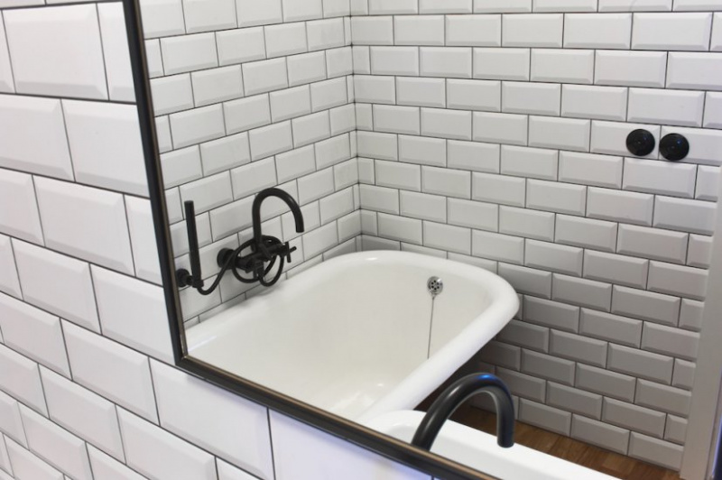 Každá z koupelen je zcela v jiném duchu. V první jsme použili zrenovovanou historickou vanu. V druhé koupelně je dominantou deska z tropického dřeva v kontrastu s betonovým povrchem stěn a nerezovým WC.
