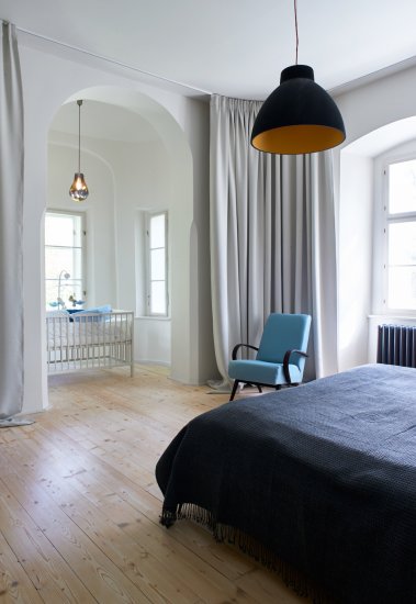 V prostoru ložnice byla kdysi kaple. Tu je možné společně s oknem oddělit závěsem, který kryje obvodové stěny ložnice. Za závěsy tak vzniká scéna krytá oponou.