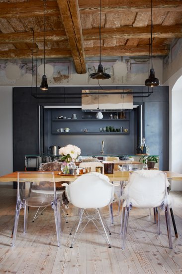 Původní představy odvážných majitelů se zcela lišily od našeho konečného návrhu. Ten se dramaticky vyvíjel v průběhu stavebně-archeologických prací. Dřevěný historický strop a původní fresky byly ukryty nad sádrokartonovým podhledem. Tuto historickou stopu jsme nemohli nechat skrytou a její oživení jsme přenechali restaurátorům. Ke zdobným fragmentům jsme do kontrastu postavili surové a industriální prvky a materiály v kombinaci s moderními solitéry.
